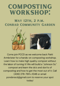 Join PCCD as we welcome back Patti Armbrister for a hands-on composting workshop held at the Conrad Community Garden on Friday, May 12th at 2 p.m. Learn how to make a high quality compost without the labor of turning it! We will build a “Johnson Su” compost and learn the do’s and don’ts of composting and how to get the most out of it. Call (406) 278-7611 x1048 or email ponderacd@gmail.com to reserve your spot today! Admission is free.